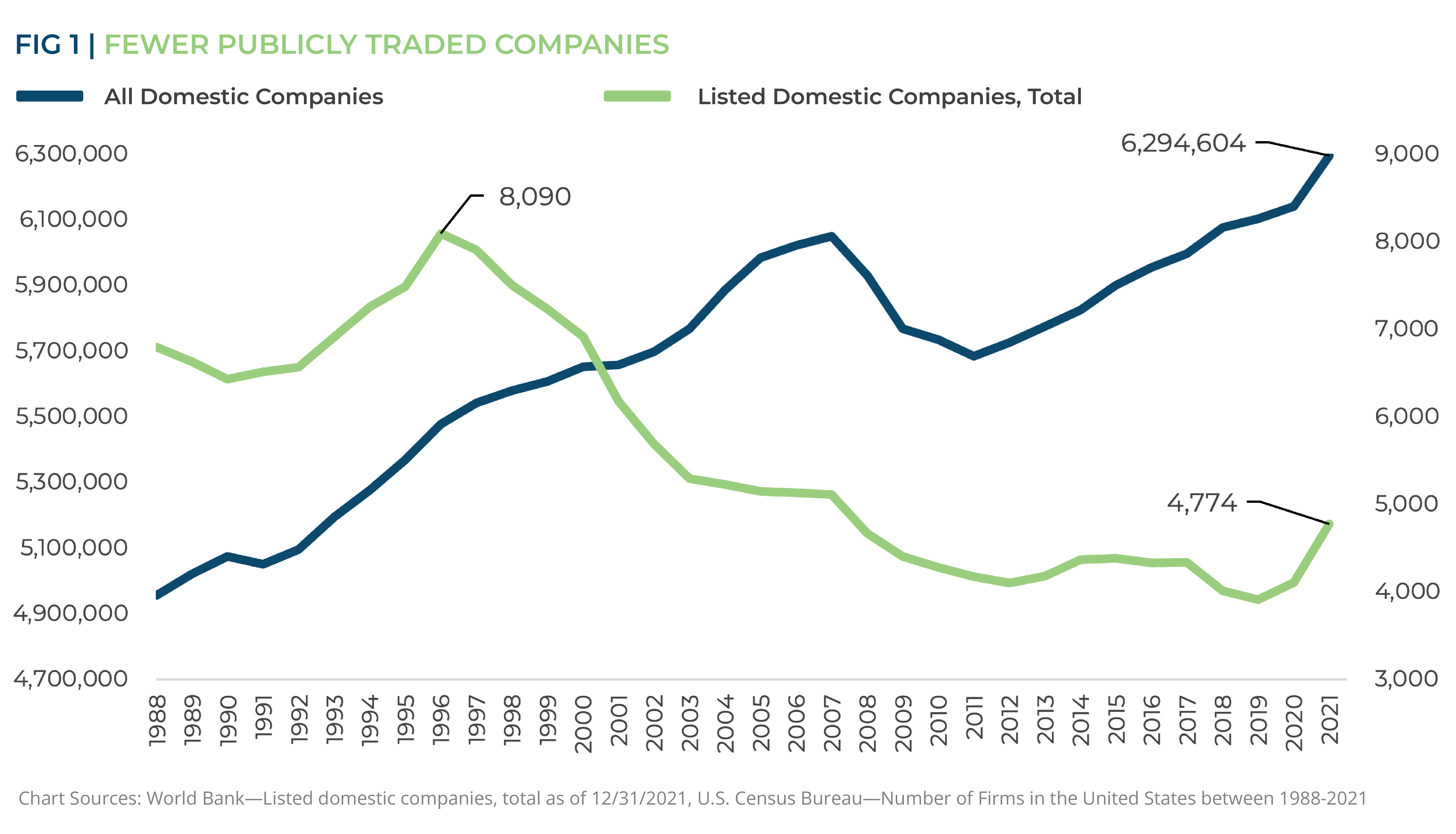 This trend reflects a broader shift among wealth and asset management firms, which are increasingly focusing on private market offerings as their accessibility increases. With rising capital availability in private markets, more companies are opting to remain private, benefiting from greater control, reduced regulatory burdens, enhanced confidentiality, flexible decision-making, and selective investor engagement. As illustrated in Figure 1, the number of public companies has nearly halved over the past three decades, while private companies have grown substantially.