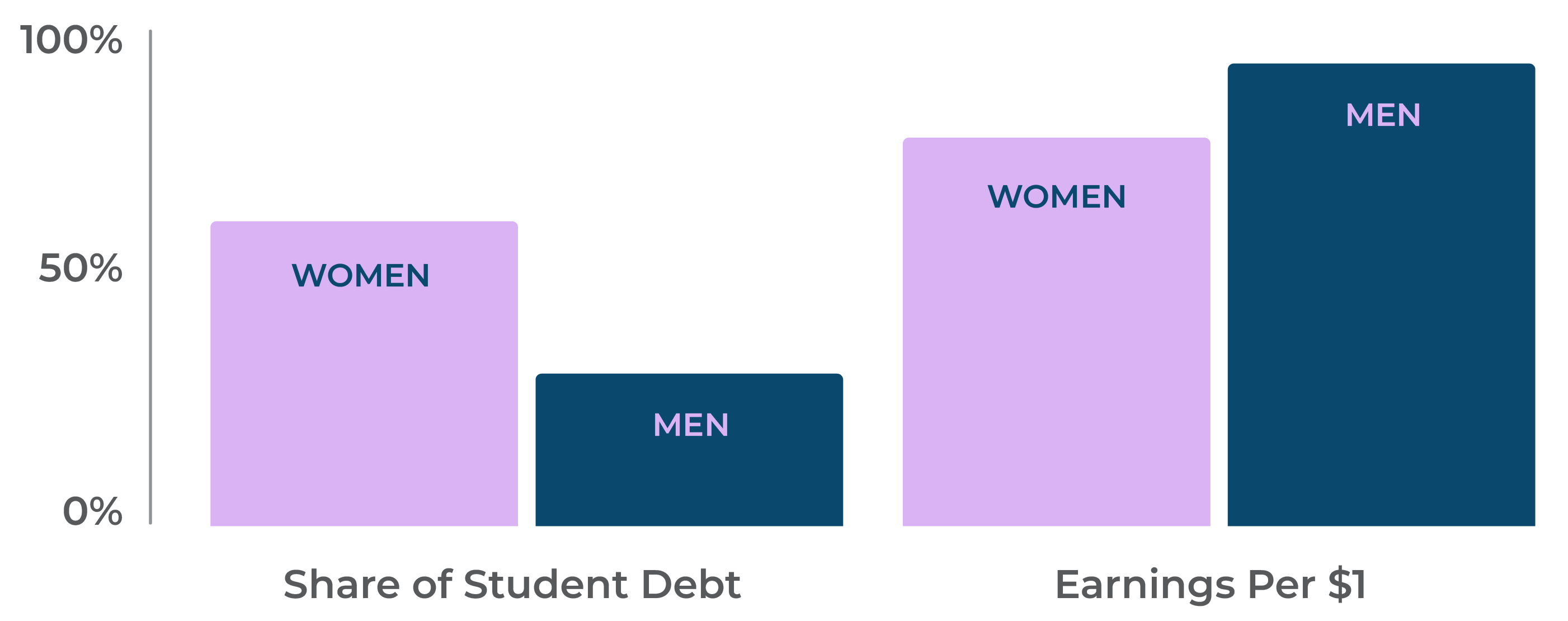 - Women carry two-thirds of all student debt (66%), while earning only 83 cents per dollar compared to men⁴.