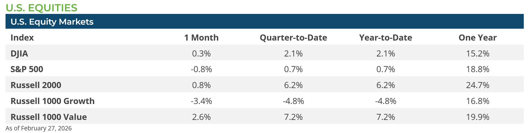 February was a month of dispersion and contrasts with lackluster returns for the S&P 500, but ample opportunities for positive returns for diversified investors. As for fixed income, anxiety had investors seeking safety in U.S. Treasuries.