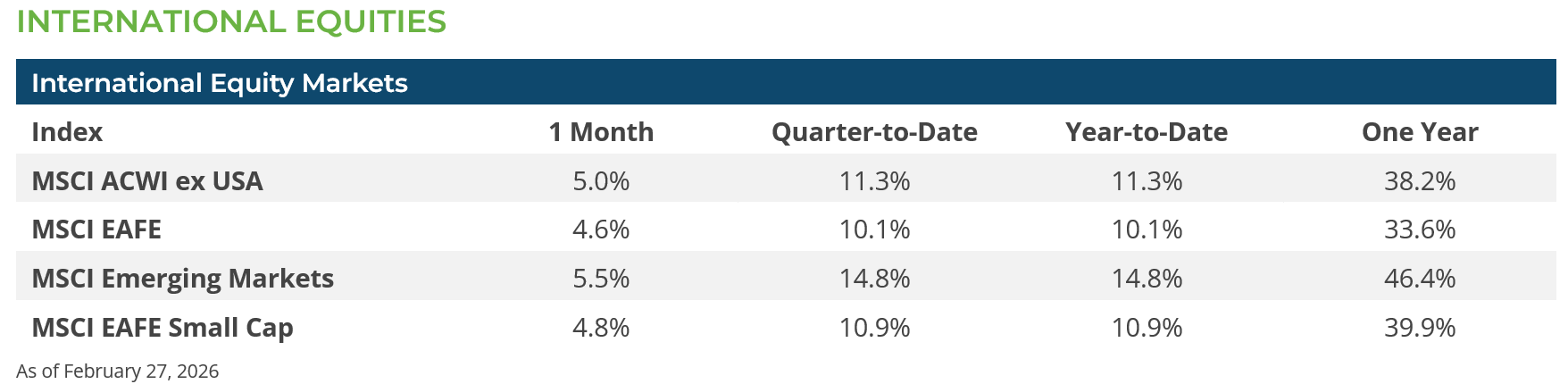 February was very good for international equity markets, with developed market equities (MSCI EAFE Index +4.6%) and emerging markets (MSCI EM Index +5.5%) both outpacing US equity returns. These gains were made despite the US dollar gaining ground modestly against a broad range of mostly developed-market foreign currencies. South Korea stood out again in February with its equity market (MSCI Korea Index) surging by over 22.6% in dollar terms on the back of continued strong gains in its semiconductor sector stocks. The gains in emerging market index stocks are also notable given that Chinese equities (MSCI China Index -5.8%) were a drag on global market stock markets as the Chinese government contemplated new taxes on some tech sectors that weighed on market sentiment.