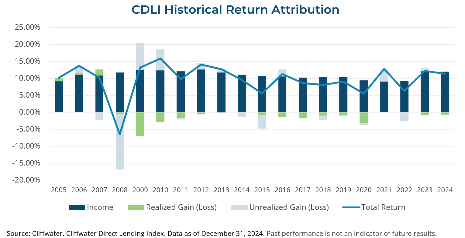Direct lending has been tested across five unique credit cycles: The Global Financial Crisis (GFC), the European banking crisis, energy sector distress, COVID, and the 2022 recession head fake. Since 2005 the total return by calendar year of the CDLI has averaged 9.65%, with 2008 standing as the lone year of negative performance.