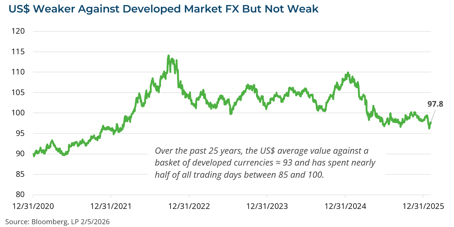 Nonetheless, the policies of the Trump administration this year may lead to additional dollar weakness. The President has been vocal about his desire to see US interest rates cut further—which would, all else held constant act to weaken the dollar. Equally, the President has often times stated a desire for a weaker dollar to curb imports and improve export competitiveness. Similarly, if the economy reaccelerates in the coming months—see RC 9-Feb—then investors may again begin to fret over inflationary pressures. Rising inflation and a dovish Fed is a recipe for further dollar weakness. Lastly, the fiscal position of the US government could take a hit from a Supreme Court decision rolling back some the President’s tariffs which could ignite concerns over the long-run debt levels in the US. All of these things could transpire to push the US dollar marginally lower in the near-term against a basket of currencies.