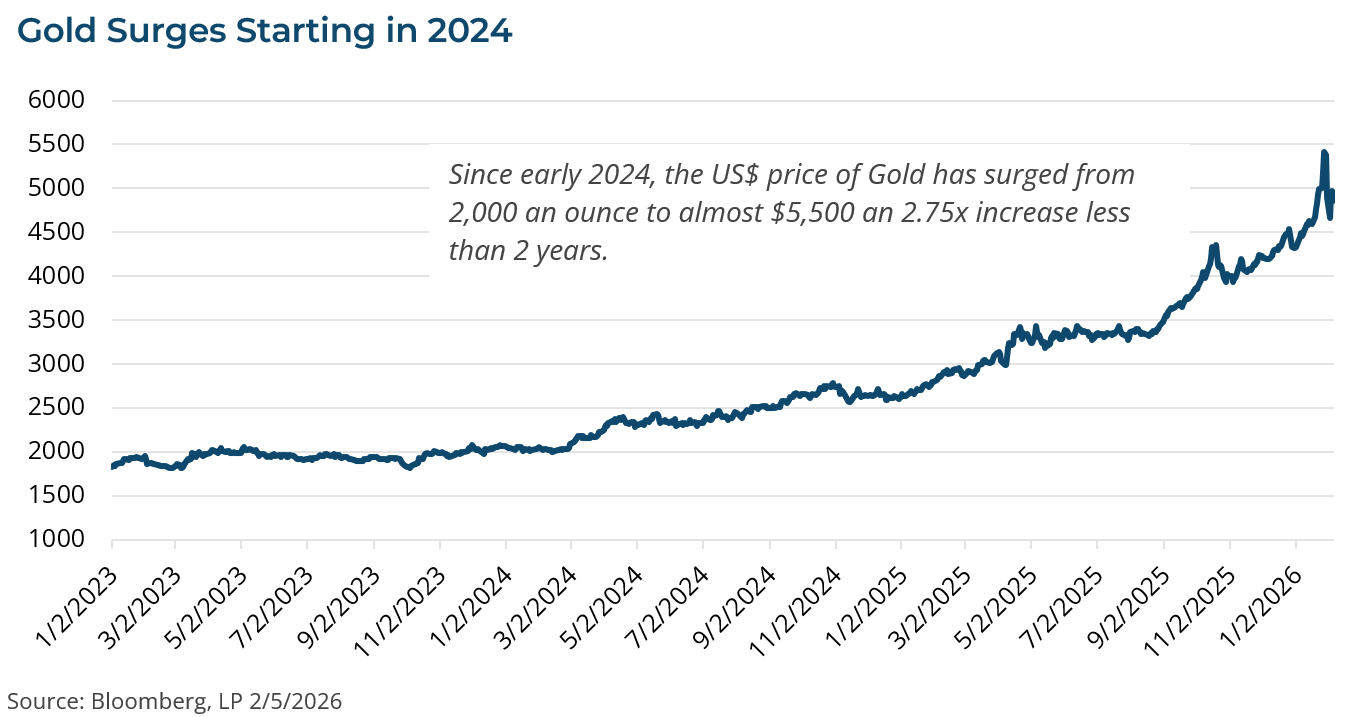 Indeed, there is some substance behind each of these “signs” of the US dollar debasement trade. However, there are also aspects of the debasement trade that seem overdone and so are some of the implications for US markets as a result. First, the price of gold (and silver) has moved sharply higher in the past 24 months. Some of the movement in gold prices has been due to the increase in structural demand by global central banks to diversify their foreign holdings away from dollars to gold and other precious metals.[2] China, in particular, has been actively increasing its holdings of gold, particularly since the US sanctioned Russia in 2022.[2] But the increase in global central bank buying—which is typically pretty stable quarter to quarter—is unlikely to be the proximal cause for the surge of the price of gold. A more reasonable explanation is simply speculation and FOMO trades. Flows into ETF gold strategies surged last year with the AUM of gold ETFs doubling last year to nearly $560 billion.[3]