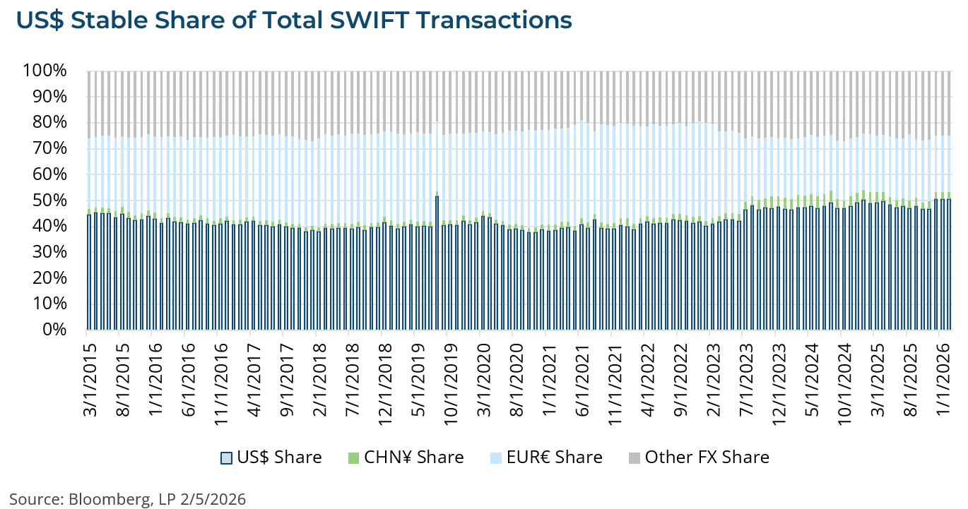 SWIFT data—a global multi-currency transaction network—shows approximately 50% of global transactions are in US dollars and this share has been stable over the past several years.[1] Conversely, China’s payment system—called CIPS and designed to compete with SWIFT—handles less than 3% of global value.[6] Furthermore, 88% of FX trades and 50% of global trade invoices are denominated in US dollars.[7] The dollar share of global reserves is 58%, down from 71% at the peak, but this has been stable for five years.[8] Similarly, the upward movement in gold, industrial metals, and other commodities in recent months directly reflects the fact that most of what is bought and sold in the world is denominated in US dollars—their prices have risen as the US dollar has weakened, keeping the net cost to foreign buyers largely unchanged.