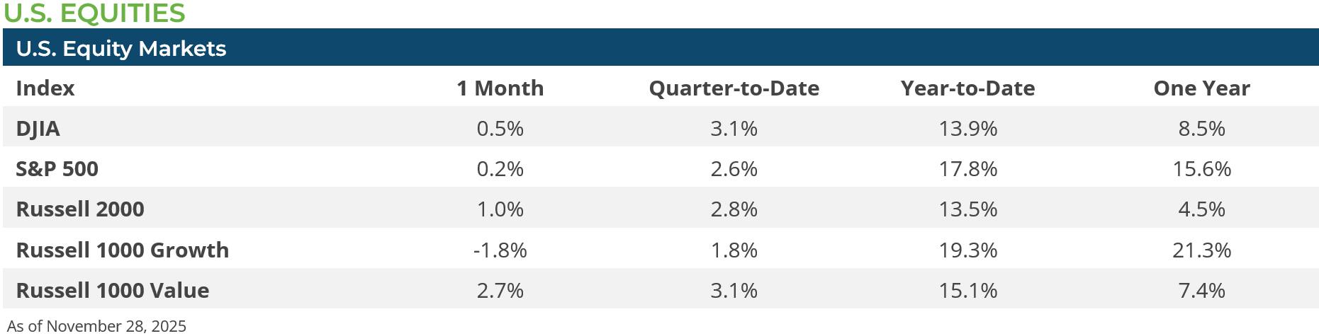 Equity markets opened up November with a bout of volatility. After 36 separate record highs in 2025, including eight that occurred in October alone, the S&P 500 largely sold-off for the first three weeks in November.[2] However, a strong finish to Q3 earnings season and a bevy of Fed speakers late in the month indicating that a mid-December rate cut was likely powered the S&P 500 to recoup most of its losses for the month. In the end, the S&P 500 traded close to flat, while mid-caps (Russell MidCap Index +1.3%) and small caps (Russell 2000 Index +1.0%) both made gains for the month. The gains were broad-based in November, with tech stock losing 4.3% along with Consumer Discretionary down -2.4% and Industrials down 0.9%, but all other sectors made gains, led by Healthcare which was up 9.3% for the month. Growth stocks (Russell 1000 Growth Index -1.8%) lagged their value peers (Russell 1000 Value Index +2.7%) because they were dragged down by the Magnificent 7 (Alphabet, Amazon, Apple, Meta, Microsoft, NVIDIA, and Tesla) which collectively was down 1.1% during the month.