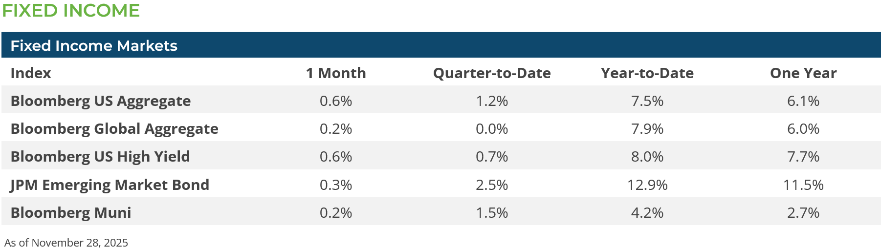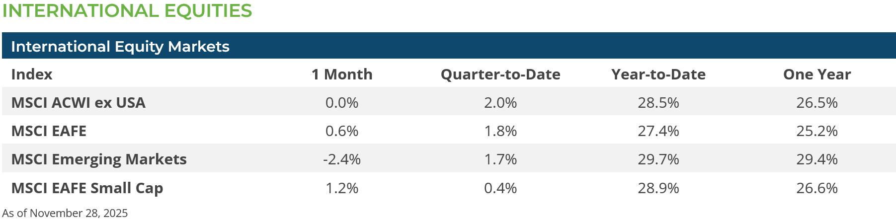 International equities also saw mixed results for November. International developed market equities (MSCI EAFE Index +0.6%) made modest gains during the month, but emerging market equities (MSCI EM Index -2.4%) lost ground. Emerging market equities were, in part, dragged down by Chinese equities (MSCI China Index -2.5%) which were under pressure as several economic indicators surprised to the downside and some companies reported negative earnings pressure. Similar to the US, international small caps (MSCI ACWI ex US Index +0.8%) outpaced their large cap peers in November (MSCI ACWI ex US Index -0.0%). The US dollar traded in a fairly narrow range in November and did not have a material impact on non-US equity returns.