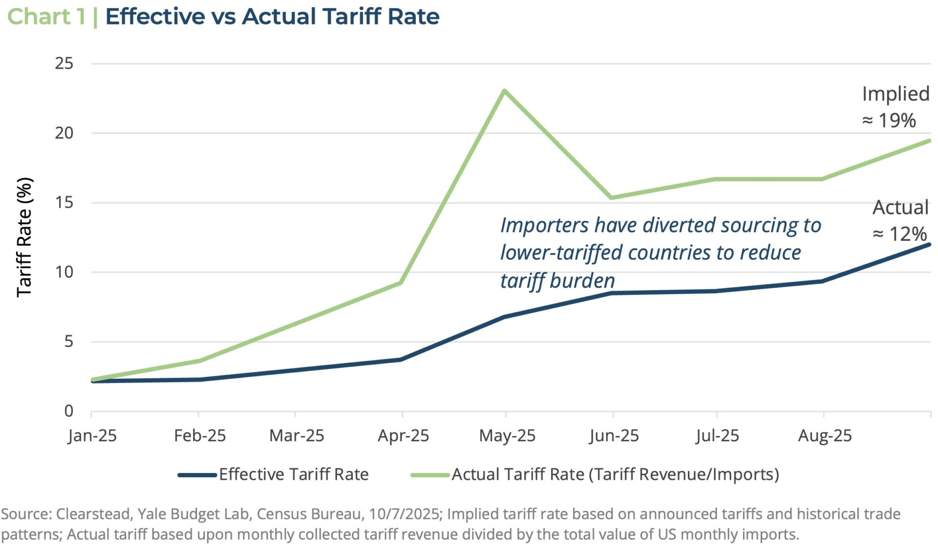 After a weak Q1—which was negatively skewed by a surge in imports—the US economy accelerated in Q2 and Q3 as the impact of the US’s new tariff policy proved to be less disruptive than initially feared. In part, the resilience of the US economy in the face of the new tariff policy seems to be fourfold. First, many firms built up inventory ahead of the announcement of the new tariff policy in early April—hence the negative trade impact on Q1 GDP (-0.6%).[1] Second, the Trump administration suspended many of the tariffs as they worked out a series of trade deals and frameworks that ultimately lowered the tariff levels. Additionally, many firms seemed to be able to source input supplies from lower-tariffed sources and thus while the headline effective tariff rate approached 20% by late summer, the actual tariff rate—the amount of tariff revenue divided by total imports—was only about 12% by the end of Q3, as seen in Chart 1 below. Lastly, while policy uncertainty may have blunted robust investment and hiring in many parts of the economy, the AI-induced buildout of datacenters and the development of AI models continued to surge. The end result was that most of corporate America was able to navigate the new tariff regime reasonably nimbly and both top-line sales as well as corporate profits beat expectations in the first half of the year.