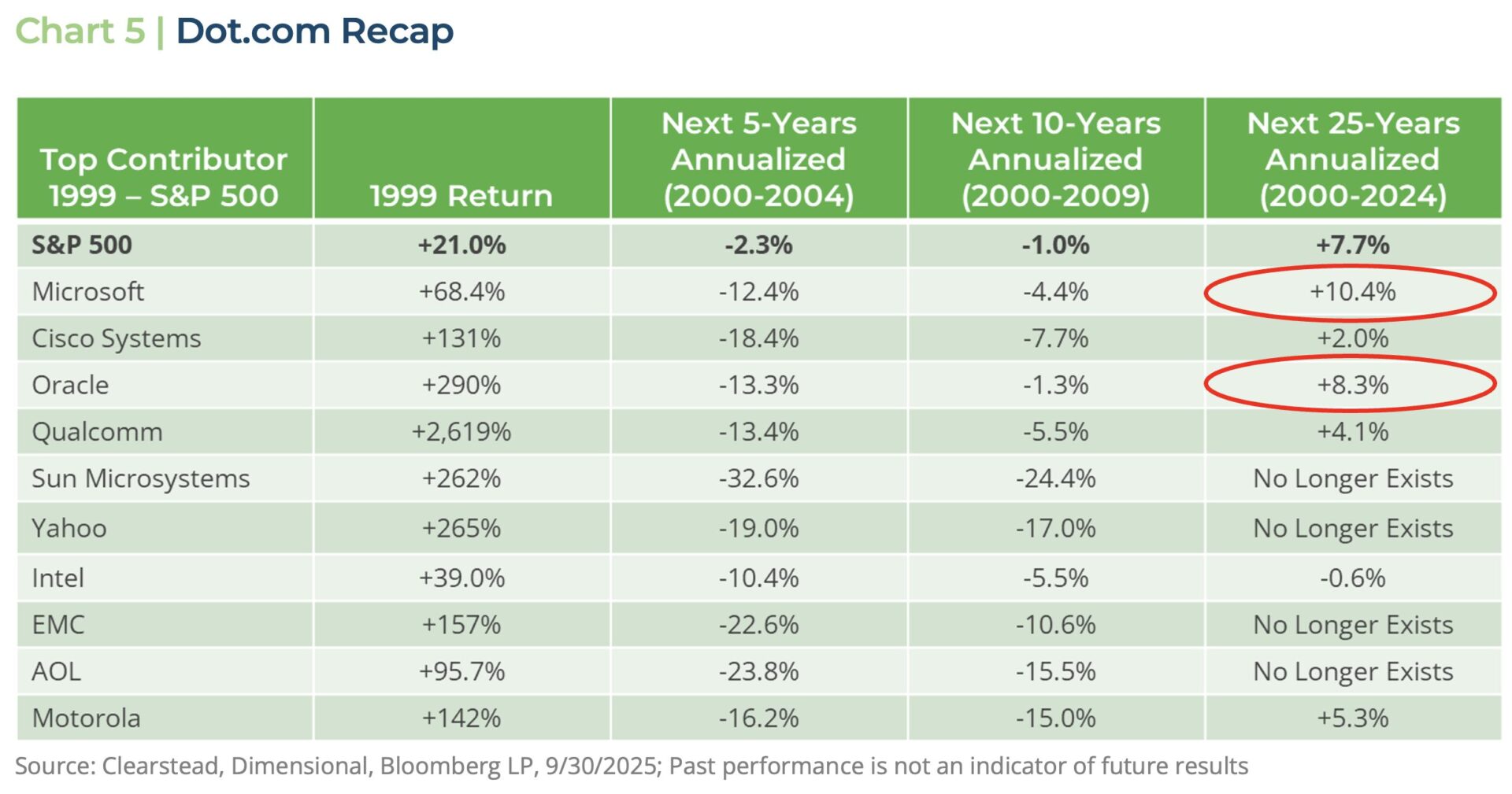 On the flip side, markets are increasingly focused on good news and seem a little indifferent to the risks that are lurking in the background. For instance, we know from the dot.com days that many of the firms that rose the most in the late 1990s were not the ultimate winners in the new internet economy. As seen in Chart 5 below, the firms that contributed the most to the stellar returns of the S&P 500 in 1999 ended up lagging the index over the next five years as the dot.com euphoria ended. Over the next 25 years only two tech companies from the late 1990s—Oracle and Microsoft—went on to return more than the index, while many prominent dot.com tech companies—such as Yahoo, EMC, AOL, and Sun Microsystems—ceased to exist in their previous corporate structure. In 1999, almost no one could have predicted that companies like Amazon—in its infancy in the late 1990s—or Alphabet (Google) and Meta (Facebook)—which did not exist during the dot.com boom—would prove to be some of internet-age’s biggest winners for shareholders. AI is likely to be a transformational technology akin to electrification but that many of the ultimate winners of this new technology are likely yet to be discovered.