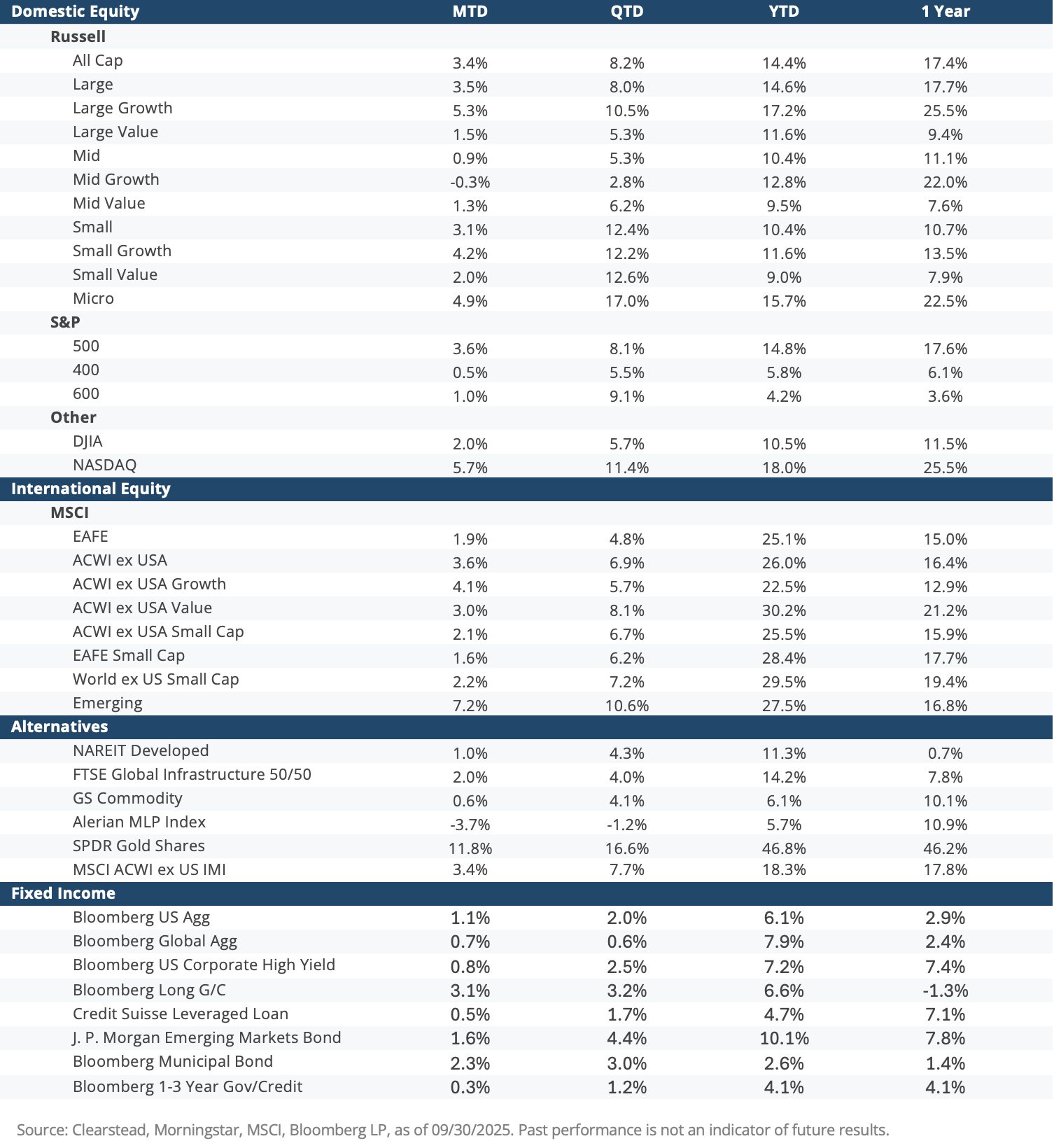 Information provided is general in nature, is provided for informational purposes only, and should not be construed as investment advice. These materials do not constitute an offer or recommendation to buy or sell securities. The views expressed by the author are based upon the data available at the time the article was written. Any such views are subject to change at any time based on market or other conditions. Clearstead disclaims any liability for any direct or incidental loss incurred by applying any of the information in this article. All investment decisions must be evaluated as to whether it is consistent with your investment objectives, risk tolerance, and financial situation. You should consult with an investment professional before making any investment decision. Performance data shown represents past performance. Past performance is not an indicator of future results. Current performance data may be lower or higher than the performance data presented. Performance data is represented by indices, which cannot be invested in directly.