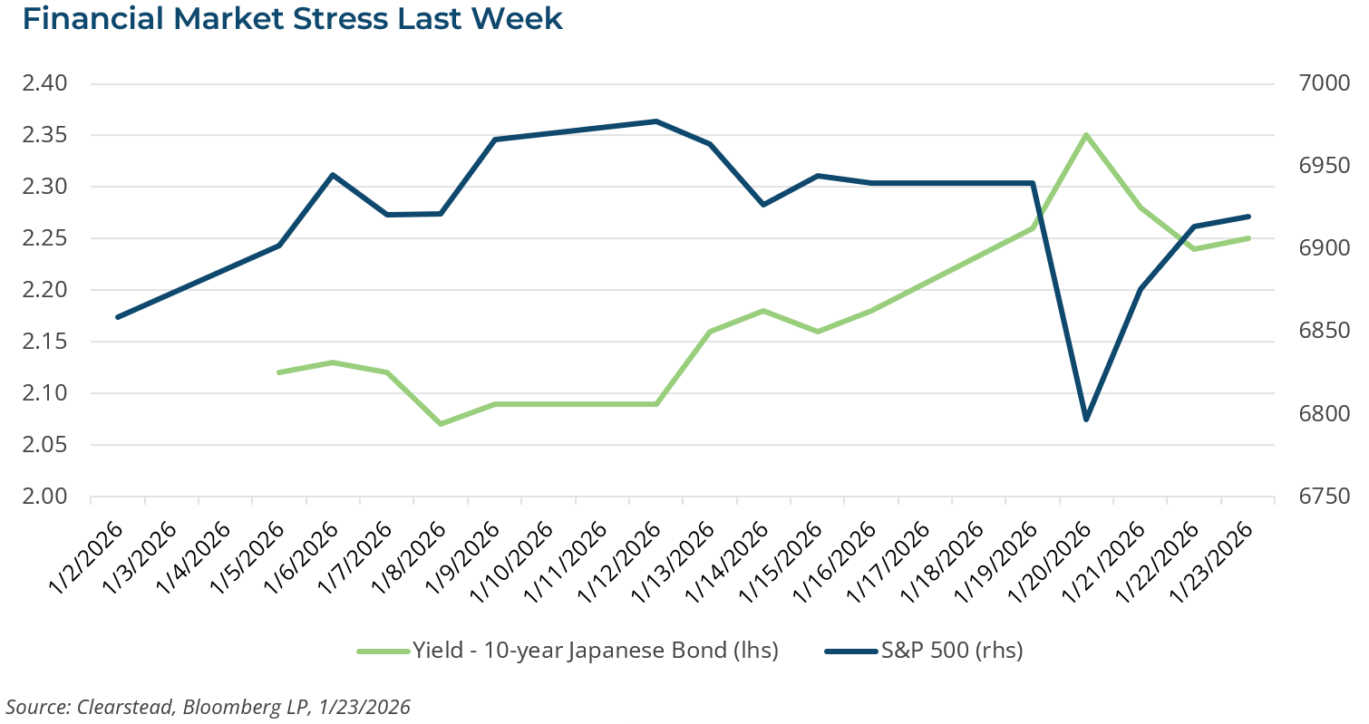 Markets suffered their first bout of volatility in 2026 last week, with the S&P 500 falling more than 2.0% on Tuesday, 20 January. The VIX—the so-called fear gauge—moved above its long-run average and closed over 20, and the yield on the 10-year Treasury moved up by over 15 basis points from the prior week to 4.29%. The trigger was the concern that the Trump administration might impose an additional 10% tariff on several European nations opposing US efforts to gain sovereignty over Greenland. President Trump initially said all options were on the table, but in his speech at the World Economic Forum in Davos, he ruled out using the US military to seize the island territory from Denmark. Following a flurry of diplomacy at Davos, he then announced that no additional tariffs would be needed and that the US and Europe had negotiated a “framework for a deal” intended to deliver US objectives in Greenland. While the specifics of any future Greenland agreement remain unclear, markets quickly discounted the risk of a negative tail event, with equities gaining most of their losses back by the end of the week. Greenland’s significance is rooted in national security: to achieve the administration’s “golden dome” missile defense ambitions, additional US military assets would likely need to be stationed there. How much land is required for these assets—and how much territory and legal sovereignty Denmark and Greenlanders are prepared to cede—remains uncertain. It appears the US, Denmark, and other European NATO allies may expand a 75-year agreement that already gives the US military broad latitude to operate in Greenland. Nonetheless, despite the lack of details, markets breathed a sigh of relief and volatility in the Japanese debt markets also eased late last week, which have allowed markets to refocus their attention on earnings, interest rates, and economic growth. Market stress often erupts from unexpected sources, reinforcing both the discipline to look past short-term noise and the importance of maintaining a well-diversified portfolio.