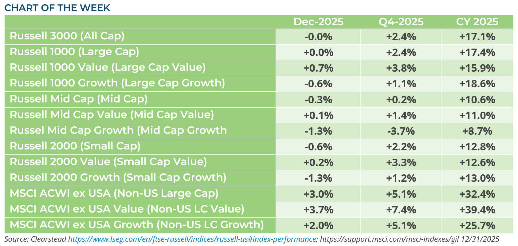 Well, 2025 is in the books. December continued many of the trends that defined much of Q4. US large caps (Russell 1000 +0.0%) were flat on the month, but outperformed US small caps (Russell 2000 -0.6%), which lost ground in December. The same was true for the full quarter (Q4 Russell 1000 +2.4% vs. Q4 Russell 2000 +2.2%). Overall, Q4 witnessed a broader set of winners than in previous quarters. For instance, the value factor beat the growth factor in December as well as for the entirety of Q4—see Chart of the Week. However, for the full year, large-cap growth-oriented stocks outperformed their value-oriented peers. We saw the inverse of this for mid-cap stocks for 2025, which saw value-oriented names steadily outperform growth-oriented stocks. For small caps, there was little difference between the performance of the growth and value factors by the end of the year. While December saw several sectors decline for the month, only Real Estate (-2.0%) and Utilities (-1.4%) lost ground during the quarter. For the full year, every sector registered gains with Communication Services gaining the most (+33.6%) and Real Estate gaining the least (+3.2%). Outside of the US, results in December and Q4 were consistent with what has transpired steadily throughout the year. Value-oriented stocks consistently outperformed their growth-stock peers, and, similar to the US, small cap names underperformed large-caps for the full year. As we head into 2026, some strategists are painting a bearish picture—a US economy that looks increasingly weak, stretched equity valuations, talk of an AI-stock bubble, and three-straight years of robust returns (S&P 500: 2023 +26%, 2024 +25%, 2025 +18%). In addition, mid-term election years are typically the weakest for the S&P 500 within a four-year presidential cycle. As we look out over the investment landscape, Clearstead is reminded that the consensus estimates for next year’s corporate profits look solid—in the 11%-13% YoY range—and that a broader set of companies seems likely to prosper. Could the rotation that began in Q4 have legs? Global liquidity is not under stress, and the US labor market, while fragile, remains stable. Valuations are a cause for concern, but multiples do not typically contract significantly when margins are stable-to-expanding, which is the likely backdrop for corporate earnings in 2026. Given this environment, our baseline outlook is that, absent a significant negative shock, markets are poised to grind higher. While 2026 may not feature the strong returns to which we have become accustomed, it is likely to reward the patient investor.