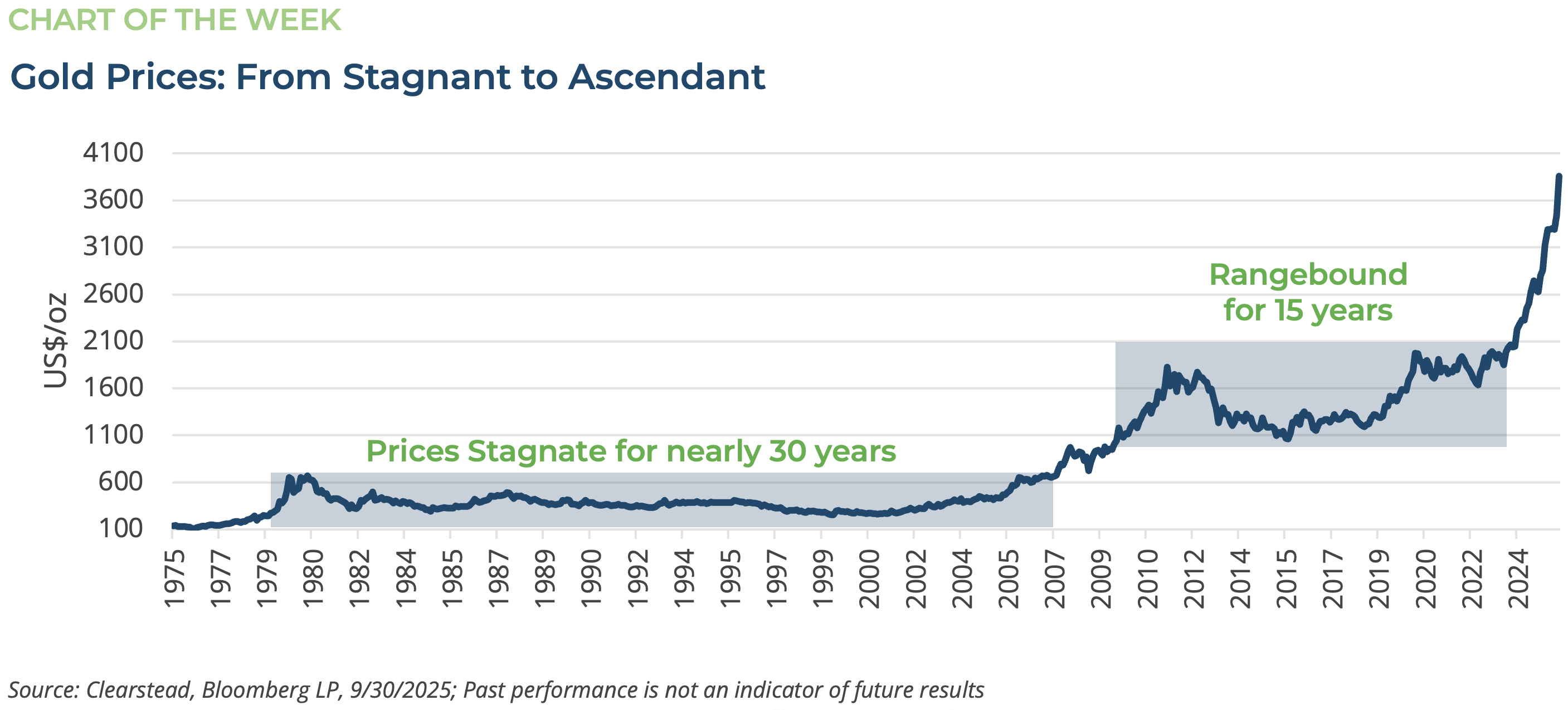 Gold is having a moment. It is up over 60% year-to-date (YTD). Moving from $2,650 a troy ounce to over $4,300 last week. What is driving this surge in gold prices this year? How high could gold prices go? There are several factors at play with gold prices at present. Structural buying, which has been elevated in recent years, stems from both foreign central banks as well as rising overall global wealth levels. Foreign central banks have been adding to their gold reserves over the past five years, in part because the US was so successful in freezing Russian financial assets—primarily dollar-based assets (cash equivalents, bonds and other financial assets)—after it invaded Ukraine in 2022. Given that Russia was unable to evade sanctions, particularly on its dollar and euro-based assets—many central banks have been increasing their purchases of physical gold and storing them either at home or in neutral, non-aligned countries. Secondarily, as the global middle class has expanded in recent years—much of this growth has taken place in south Asia—these households have turned to gold as a preferred option to invest extra money. While these two phenomena can explain some of the increase in gold prices over the past few years, they cannot alone explain the near tripling of gold prices since the beginning of the Covid Pandemic nor the strong surge in gold prices YTD. Two other interrelated factors are likely driving some of the recent surges in gold prices. One is the notion of global currency debasement. In many countries, including the US, governments have been unwilling to rein in spending and reduce their economies’ overall debt levels. Recently the IMF projected that global government debt is likely to rise above 100% of global GDP in the next few years. As result, investors are starting to fear the global price levels (inflation) will rise more quickly than previously appreciated. Hence, gold is acting as a hedge against the risk that global inflation surprises to the upside more than in decades past. Lastly, it is speculation and momentum. In the mid-to-late 1970s gold also surged in value as US inflation spiked and the removal of the US from the gold standard ushered in a period of global currency volatility. Gold prices moved up less than $100 per ounce to a high of over $800 per ounce before settling down to a range of about $350 to $450 per ounce. In those days, physical gold—bars, coins, or jewelry—had to be purchased and those that chased investments in the late innings of the gold rally in 1979 and 1980 had unrealized losses for over 25 years—gold prices did not move above $600 an ounce again until 2006. Today, one can buy fractional amounts of gold—physically or via an ETF. Purchases can be made on your phone or by a click of the mouse, which has the potential to only feed the gold frenzy even more than in past rallies. Gold prices could still increase from here and may eventually top $5,000 an ounce, but as was the case in the 1980s, chasing the rally as it nears a possible top could lead to buyers’ remorse in the long-run.