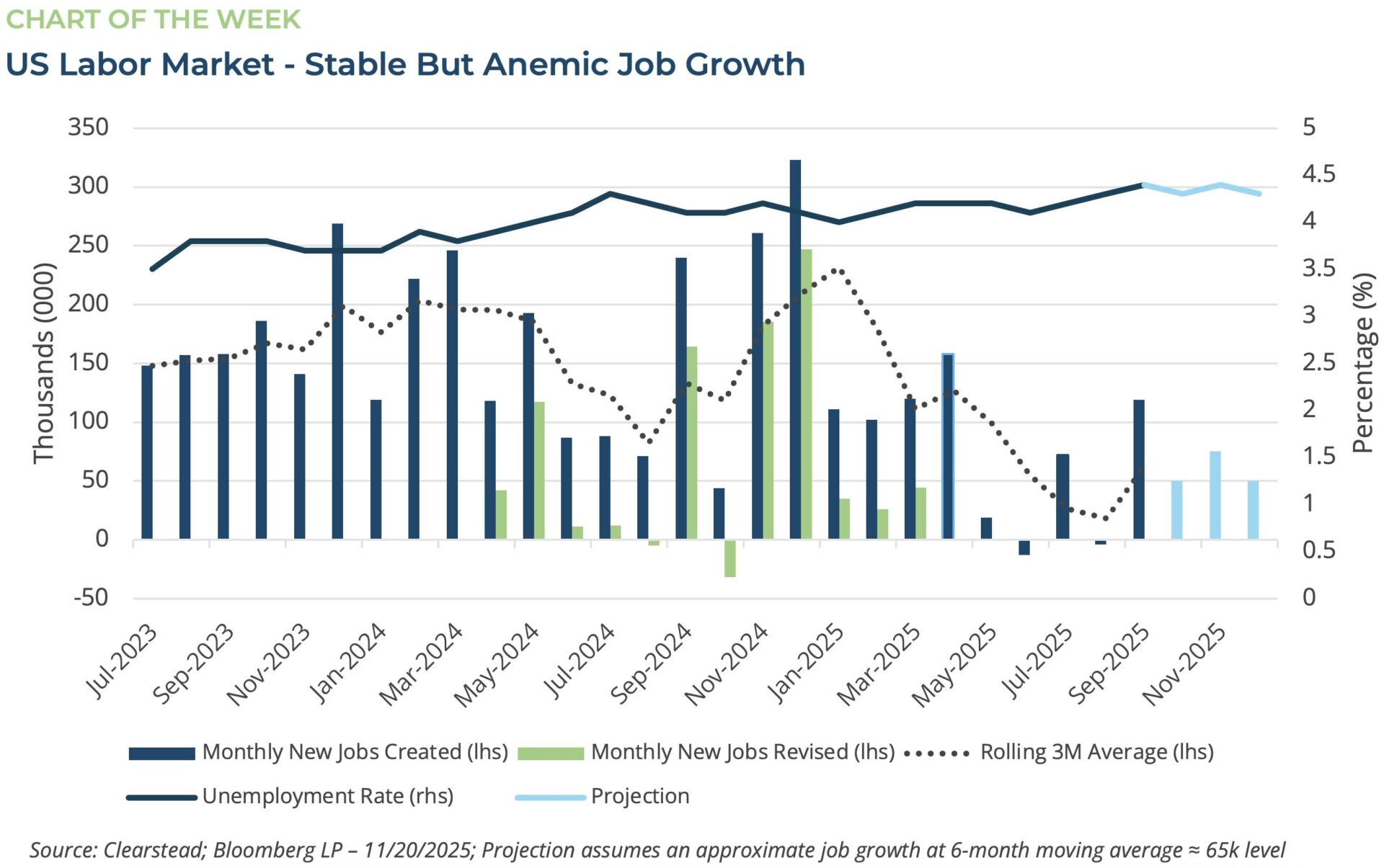 With the government reopening a slew of official statistics from the Bureau of Labor Statistics (BLS), Department of Labor (DoL), and Census Bureau were released last week. Of particular interest was the state of the US labor market. When the government shutdown commenced on 1-October, the BLS was almost ready to release the jobs report for September, so this was one of the first reports to be released by the BLS. At question, was whether (or not) the US economy had shed more jobs in September or if hiring had picked up. The September jobs report did include small downward revisions to both the July and August job figures, but it also showed that the economy had created 119k new jobs during the month—more than double the consensus expectations for 53k new jobs. While the unemployment rate increased to 4.4.% from August’s 4.3% rate, this seemed largely due to the increase in the participation rate suggesting that more people began to look for work in September. Overall, the September jobs report signaled a stable US labor market. Additionally, the DoL released the official initial unemployment claims figures covering the entire period of the government shutdown and further reinforced the notion that layoffs were stable and not rising as some had feared. While not robust, the stability of the labor market as well as solid consumer spending may give more ammunition to those Fed officials that would prefer to hold rates steady rather than provide additional policy easing. However, the influential head of the New York Fed, John Williams, noted last Friday that further policy easing in the “near-term” may be warranted to move the Fed’s policy rate closer to the neutral range where it neither spurs nor slows economic activity. Markets took note and re-priced the probability of a Fed rate cut in December at 70%, up from 35% just the day before.