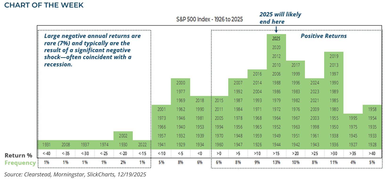 With only about a week of trading left this year, it is safe to conclude that 2025 was a good year for markets. The S&P 500 is likely to end the year at around 6,800, which would mark an annual return of around 17%, while the Bloomberg Aggregate Bond Index is set to return over 7%. This year was not without its challenges. The first 100 days of the Trump administration ushered in a new global trading framework for the corporate sector, structurally curtailed net immigration, and provided a new tax and spending framework that will dominate for several years. In early April, at the height of the worries over tariffs, the S&P 500 had lost -15% (YTD 4/8), and the prospect of a recession in the latter part of the year seemed unavoidable. In the end, the Trump administration suspended the highest tariff rates, and US firms managed their supply chains to preserve margins and maintain sales. The result was a year of strong profits and a stable economy throughout the final months of the year. As we head into 2026, it is easy to paint a bearish picture—an economy that looks increasingly weak, stretched equity valuations, a potential AI-stock bubble, and three-straight years of robust returns (2023 +26%, 2024 +25%, 2025 ≈+17%). Some may think that given this backdrop, the S&P 500 is set up to deliver poor returns, particularly because next year will feature a midterm election—typically the weakest year within a 4-year presidential cycle. As we look out over the investment landscape, Clearstead is reminded that the consensus estimates for next year’s corporate profits look solid and that a broader set of companies look likely to prosper. Global liquidity is not under stress, and the US labor market remains stable. Our baseline outlook is that, absent a significant negative shock, markets typically grind higher—see Chart of the Week. Bull markets can persist for multiple years and are typically derailed when euphoria and leverage give way to reality and tighter liquidity. At present, there does not seem to be egregious levels of investor complacency, and the fundamental backdrop to next year’s investment landscape should be supportive of further gains.