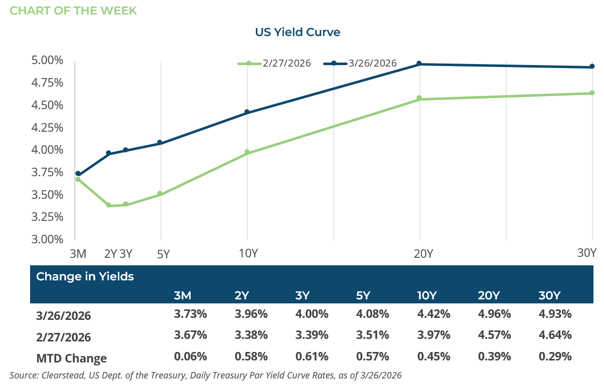 The yield curve this month can be told in three chapters. The first chapter notes that the yield on the U.S. Treasury (UST) 2-year note (3.96%) surpassed the effective Fed Funds rate (3.64%) for the first time since March of 2023. The 2-year yield is considered a leading indicator because it often moves ahead of Federal Reserve policy, reflecting market expectations for future interest rate changes. The Fed’s somewhat hawkish statement following its mid-March FOMC meeting was interpreted as a sign that the central bank has ended its easing policy. The 58-basis-point (bps) rise in the UST 2-year yield has led some forecasters to predict that the Fed’s next move could mark the start of a tightening cycle. In the second chapter, even amid a decline in equity markets and conflict between the US and Iran, the safe-haven appeal of UST bonds has not calmed fixed-income investors’ primary concern – persistent inflation. Sticky inflation above the Fed’s 2% inflation target, coupled with elevated energy prices, has weighed on sentiment. As a result, the UST 10-year yield rose 45 bps to 4.42%. The final chapter centers on persistent budget deficits that have prompted the US Treasury Department to issue record amounts of long-term debt. Interest costs on government debt are on track to become the largest expense in the federal budget. Interest outlays have already surpassed defense spending and are projected to surpass annual Medicare spending in 2028 and annual Social Security payments in 2047, becoming the single largest budget category.[2] The Center for Economic Policy Research notes, “Protecting taxpayers from large spending shocks may require shifting part of the burden onto bondholders through inflation or financial repression. Economic theory suggests that such policies may also reduce the safety of government debt and may raise borrowing costs over time if investors anticipate these risks.”[3] In this environment, long-term bonds are no longer a reliable buffer and have lost some of their appeal as a safe-haven investment; accordingly, the UST 30-year yield has climbed to nearly 5%.