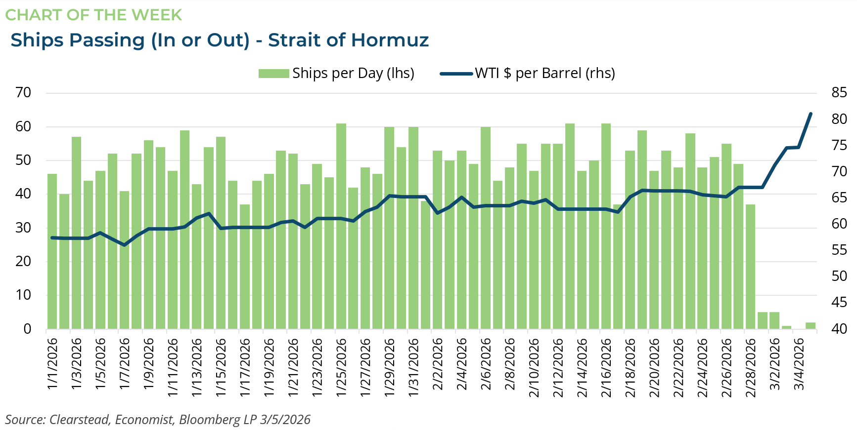 The US and Iran have been at war for just over a week (see Market Perspective 2-Mar) and global financial markets are grappling with short-run, medium-term, and lasting impact from the conflict. In the week that followed the start of the war, global equities sold off. The Russell 3000 (a broad US equity index) lost 2.2% last week, while the MSCI World ex US Index (a broad index of non-US developed market equities) lost 6.5%. Emerging market equities were hit the hardest with the MSCI EM Index down 6.7% last week. Perhaps unsurprisingly, the US dollar has rallied in this global risk-off environment. However, the conflict’s largest impact is likely to be on the global energy sector. About 20% of global oil and gas transits the Strait of Hormuz, which is a narrow corridor off the coast of Iran that is now largely closed to ships—see Chart of the Week. Shipping traffic ground to a halt after Iran announced that it would attack ships transiting the strait and fired upon several ships on 3-March. As a result, most private insurers have either pulled shipping firms’ insurance altogether for ships transiting the strait or prohibitively increased the price. The Trump administration has asked the Development Finance Corporation to step in as an insurer of last resort, but thus far the strait remains effectively closed. This has prompted oil prices to increase further with the price of West Texas Intermediate Crude (WTI) at about $90 per barrel. Equally, much of Asia and Europe depend upon natural gas exports from the Middle East that also transit the strait and natural gas prices have also increased substantially in recent days—Dutch Natural Gas TTF Futures rose from €30 per Mwh to over €50. The impact on the global economy may not be as pronounced so long as the US military is able to re-open the Strait of Hormuz either through neutralizing the Iranian ability to fire upon ships or through a broader de-escalation of the conflict within a few weeks. This is perhaps what the market is still hoping for as the baseline scenario. The conflict has widened to include most gulf states, but some speculative assets have held up reasonably well. For instance, Bitcoin made gains last week, and Goldman Sach’s US Cyclicals vs Defensive Index barely budged (-0.34%) through Thursday but declined on Friday by almost 2% suggesting that investors—at least in the US—have only just begun to change their outlook on risks and lean into defensive stocks. Should the conflict become protracted or if Iranian guerilla activities are able to keep up the pressure on global shipping in the strait even after most military operations have wound down, the economic fallout may prove to be more meaningful than what is priced into risk assets at present.